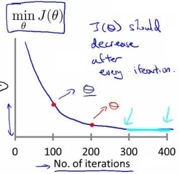 对于梯度下降何时收敛,我们进行自动收敛测试,也就是用一种算法,告诉你这个梯度下降算法何时收敛,举一个例子,如果J(θ)小于某些阈值,比如0.001、0.01、0.1等时,可以判断梯度下降算法收敛,但是这个阈值很难决定用哪些。